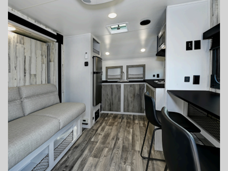 Sleeps 2 Length 21 ft Ext Width 8 ft 1 in Ext Height 9 ft 7 in Hitch Weight 424 lbs GVWR 3500 lbs Dry Weight 3116 lbs Cargo Capacity 384 lbs Fresh Water Capacity 30 gals Grey Water Capacity 30 gals Black Water Capacity 30 gals Tire Size ST205/75R15/D Furnace BTU 18000 btu Refrigerator Type 12V Cooktop Burners 2 Shower Size 24" x 36" LP Tank Capacity 20 lbs AC BTU 15000 btu Axle Count 1 Number of LP Tanks 1 Shower Type Standard Electrical Service 30 amp Similar Floorplans